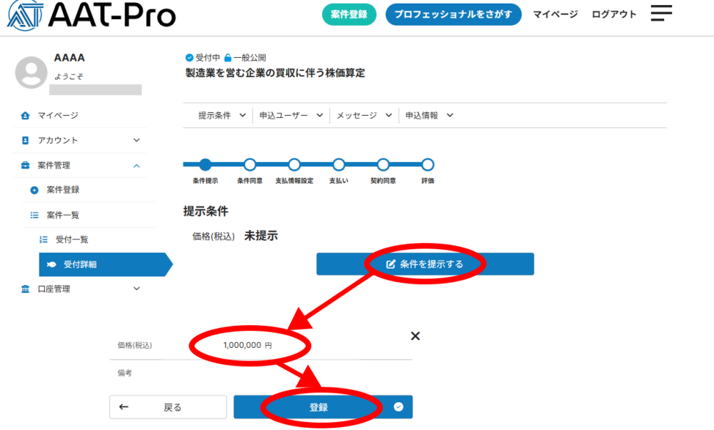 11.すり合わせが完了したら「条件を掲示する」をクリックして金額を入力し、「登録」をクリック