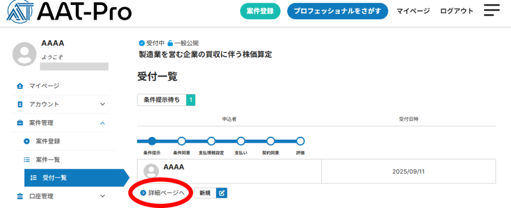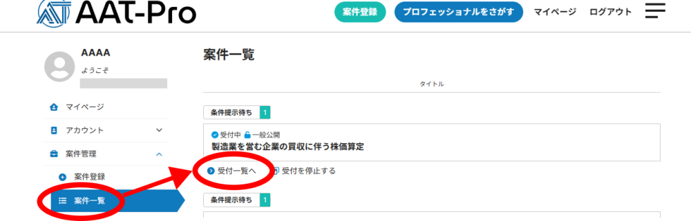 8.「案件一覧」をクリックしたのち「受付一覧へ」をクリック
