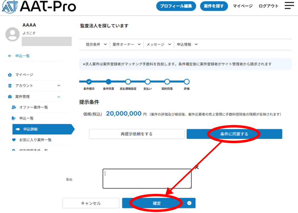 12.メッセージですり合わせた条件等に問題なければ「条件に同意する」及び「確定」をクリック