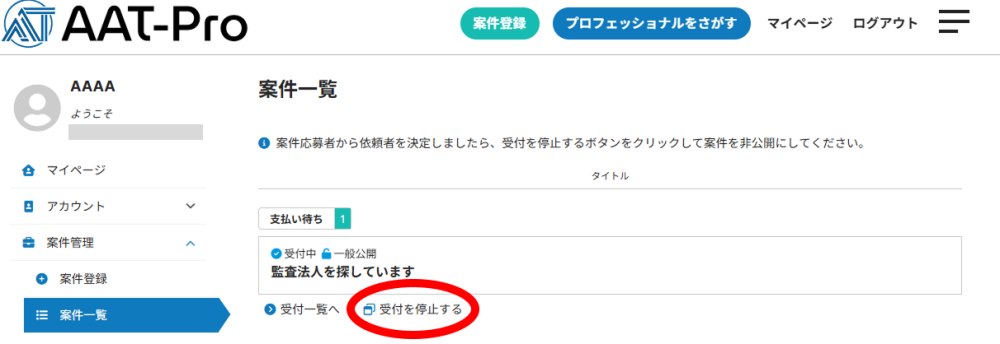 採用する案件応募者(プロフェッショナル)が確定しましたら、「案件一覧」より「受付を停止する」をクリック(受付を停止しない場合、案件が引き続き公開され応募が来ます)