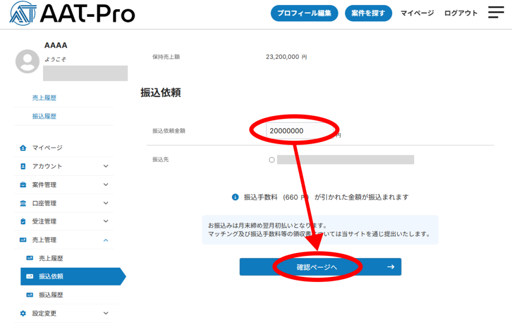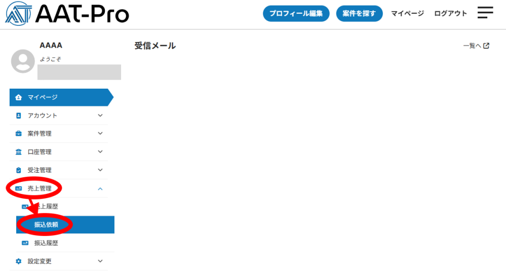 1.「売上管理」の「振込依頼」をクリック